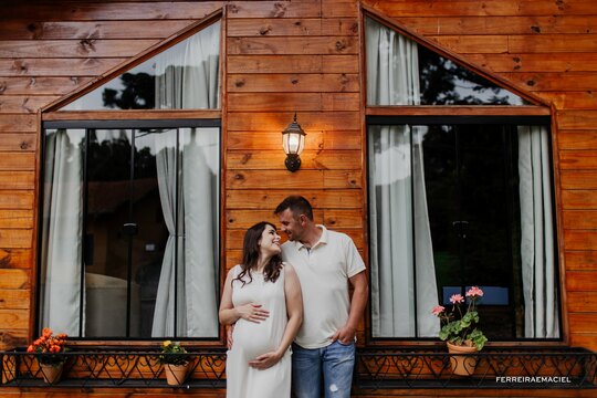 Ensaio externo de gestante em cabana, Curitibanos – SC. Um momento leve e cheio de amor, com fotografia profissional e sensível em meio à natureza.