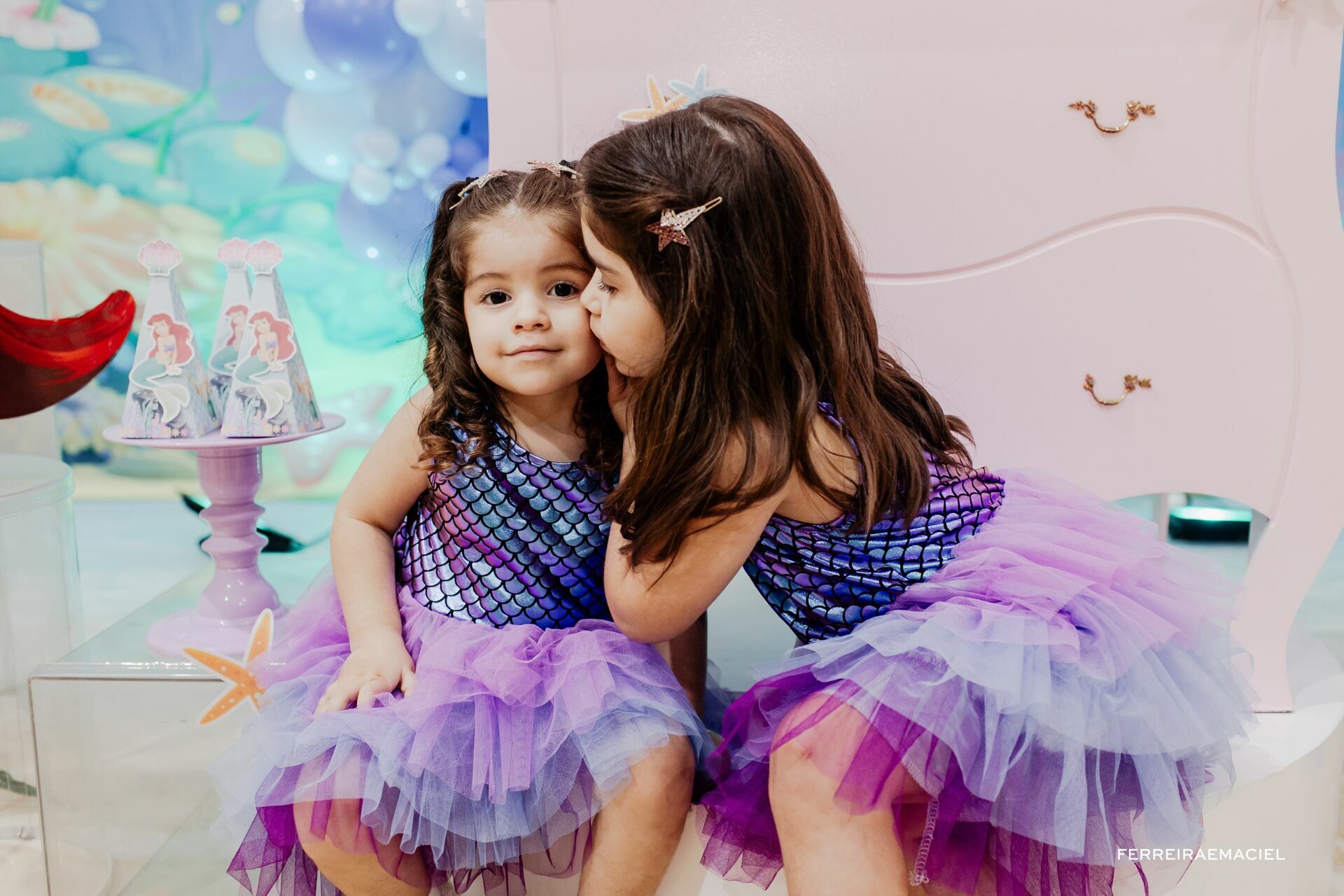 Para celebrar isso com os amigos, escolhemos o Espaço Allegra Park, aqui em Araranguá - SC. A Lígia pensou em vários detalhes, ela queria uma festa que as crianças pudessem se divertir ao extremo. Teve baladinha com pulseira neon, tatuagem, calda de sereia, tiara de Ariel e música ao vivo.