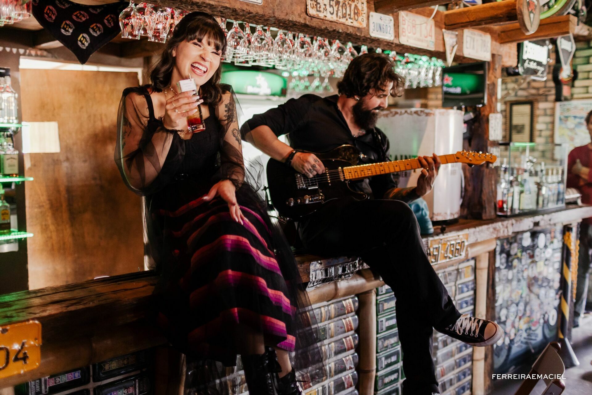 Casamento no Maverick Pub em Criciúma - SC com Folk, Rock e Indie com a Banda Juba Brothers, noiva com vestido preto, chopp e whiskey - Paula e Mateus